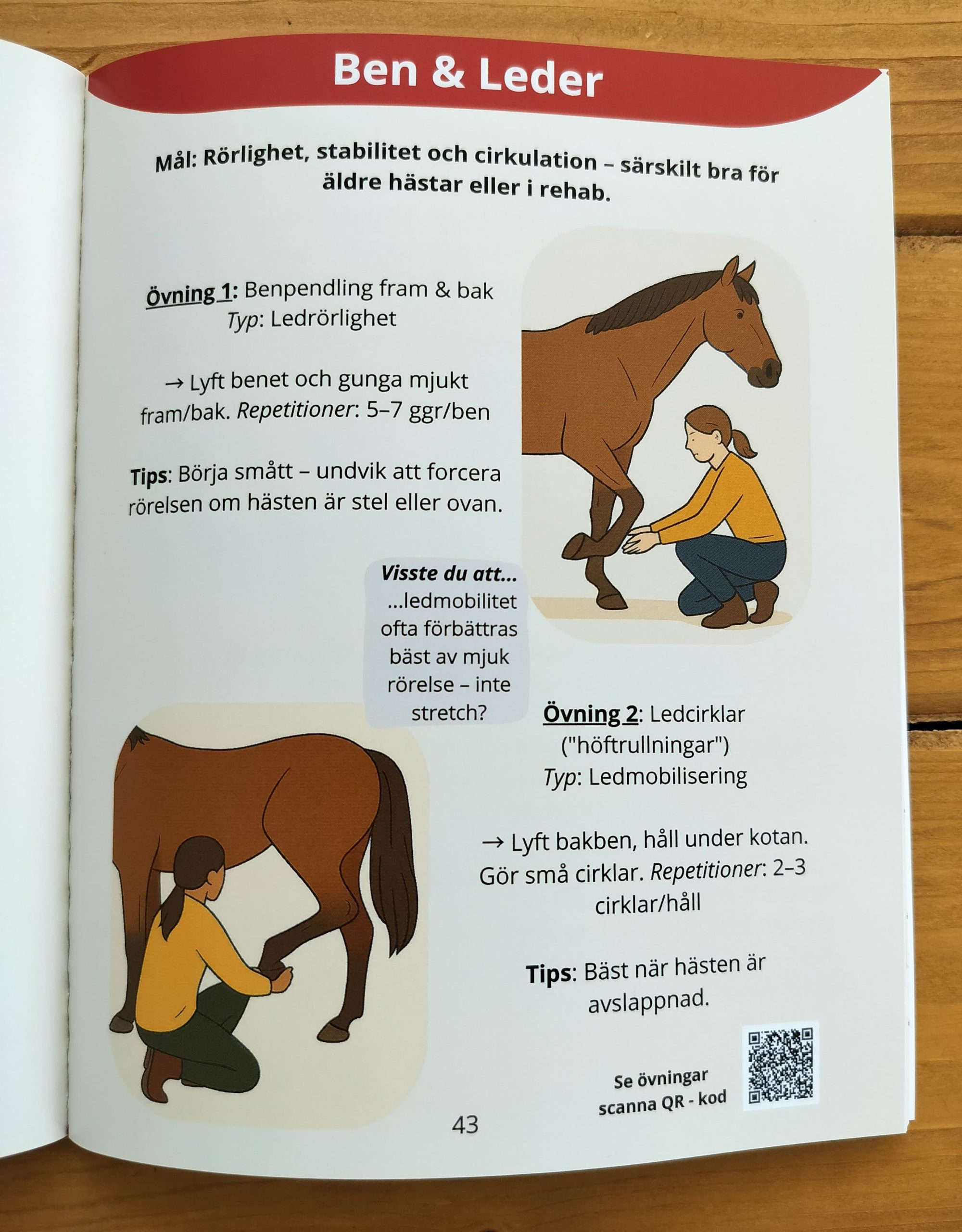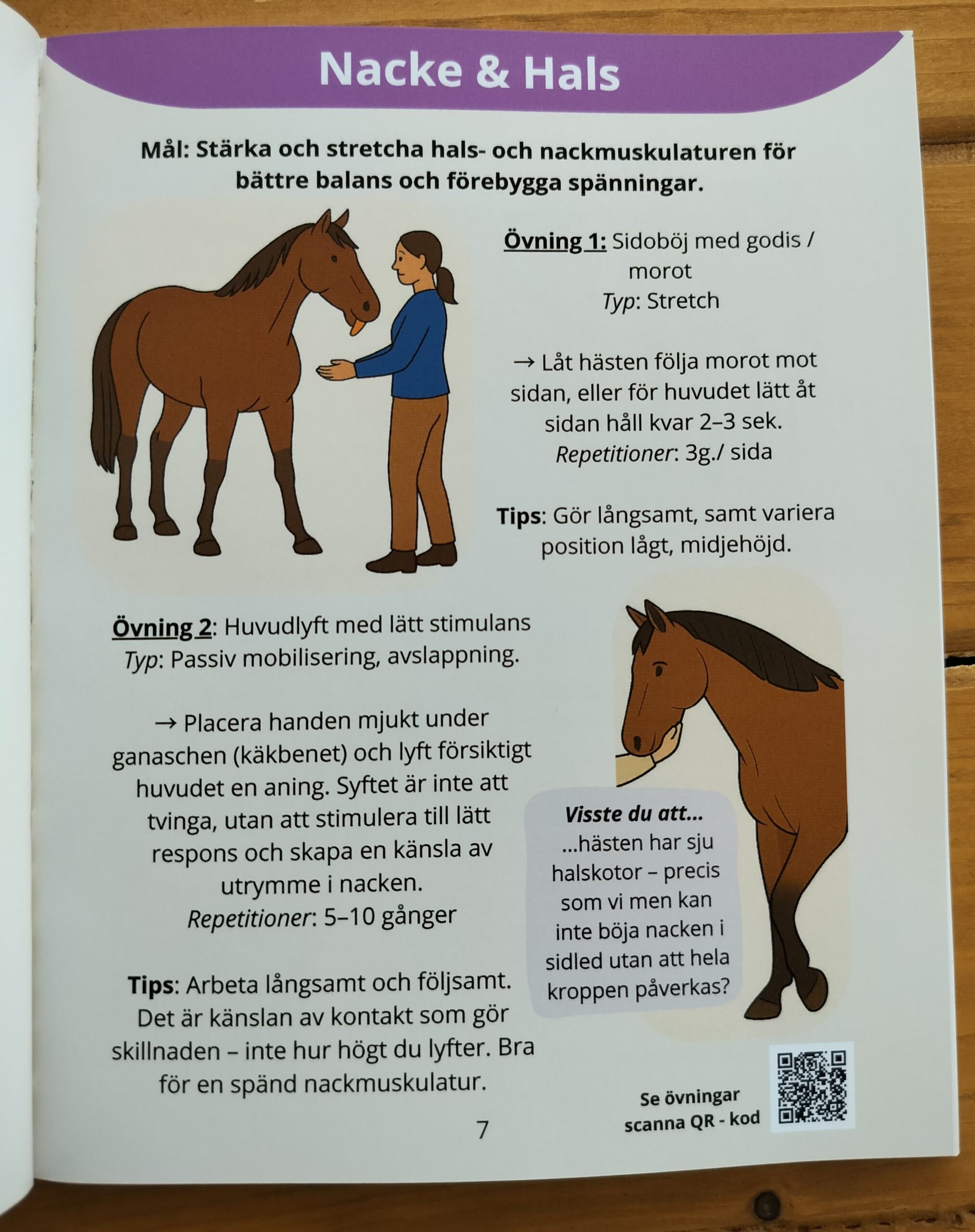 Övningarna är enkla, funktionella och lätta att väva in i vardagen. De bygger på långsamt, kontrollerat arbete som hjälper hästen att hitta bättre kroppskontroll, minska spänningar och röra sig mer avslappnat.